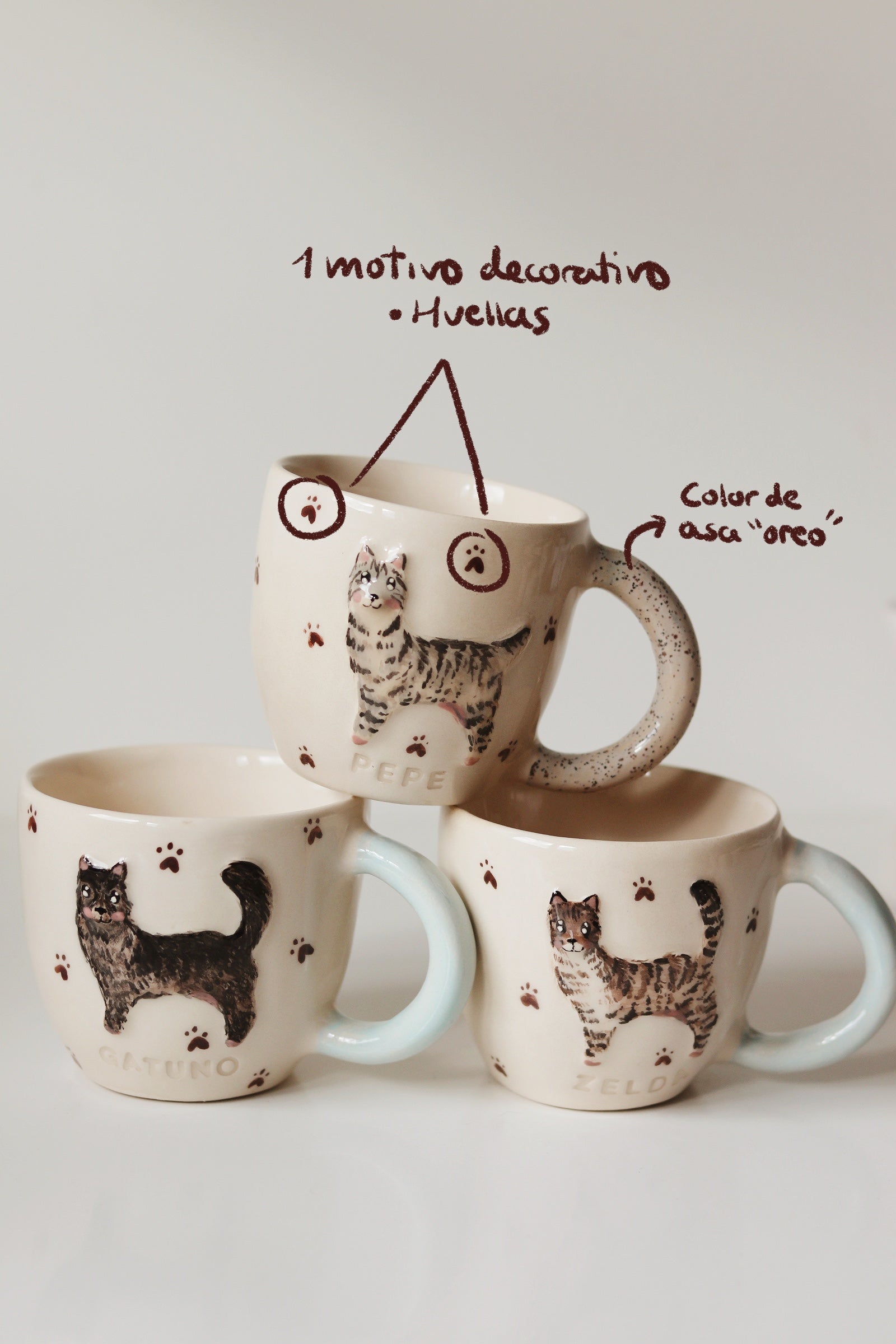 Incluye: Mascota modelada, estampado de un mismo motivo simple (ejemplos en imagen), nombre de la mascota y color de asa a elegir (ver foto).
